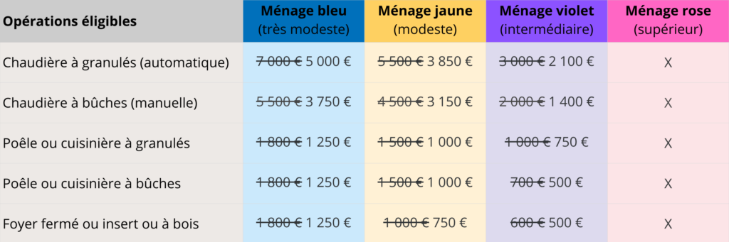 Les forfaits pour les systèmes de chauffage au bois (chaudière, poêle, foyer fermé…) diminuent en moyenne de 30 %, dans le cadre du parcours décarboné (« monogeste »).